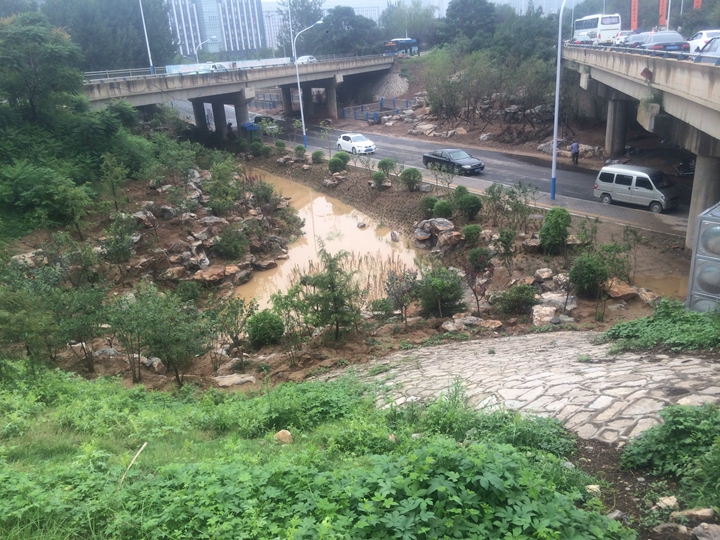 奧體西路南延原為斷頭路,道路紅線范圍及東西側(cè)空間原狀均為荒地,旅游路北橋北側(cè)原為大辛河支溝上游河道。結(jié)合本次奧體西路南延道路工程建設(shè),充分落實(shí)海綿城市建設(shè)理念,重點(diǎn)對橋下空間因地制宜進(jìn)行挖潛,精心設(shè)計(jì)建設(shè)了1500余平方的生態(tài)水塘、植草溝、旱溪等海綿工程設(shè)施。通過對旅游路部分路段雨水進(jìn)行斷接,使上游區(qū)域雨水先進(jìn)入生態(tài)水塘等設(shè)施進(jìn)行生態(tài)凈化和下滲,滲后多余的雨水再溢流進(jìn)入大辛河支溝,徹底改變了該路段原有的雨水直排模式。